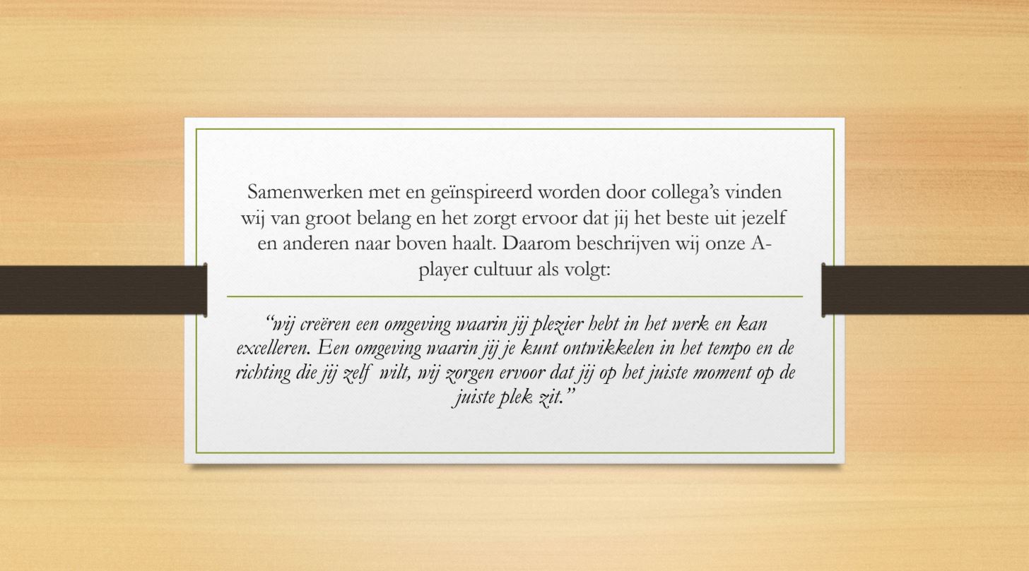 - De kracht van onze cultuur zit absoluut in de onderlinge betrokkenheid*! We zijn geïnteresseerd in elkaar(s werk), we helpen elkaar en overleggen met elkaar wanneer dit nodig is. Daarnaast maken we ook tijd om het gezellig te hebben met elkaar. Neem daarom zoveel mogelijk deel aan onze informele evenementen en activiteiten!